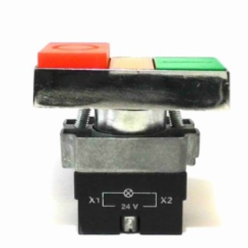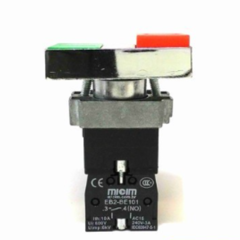 é composto por uma tecla faceada verde, e uma saliente vermelha e iluminação led 24V ao centro. Normalmente é utilizado para alimentar e cessar a alimentação em circuitos de comando com retenção.